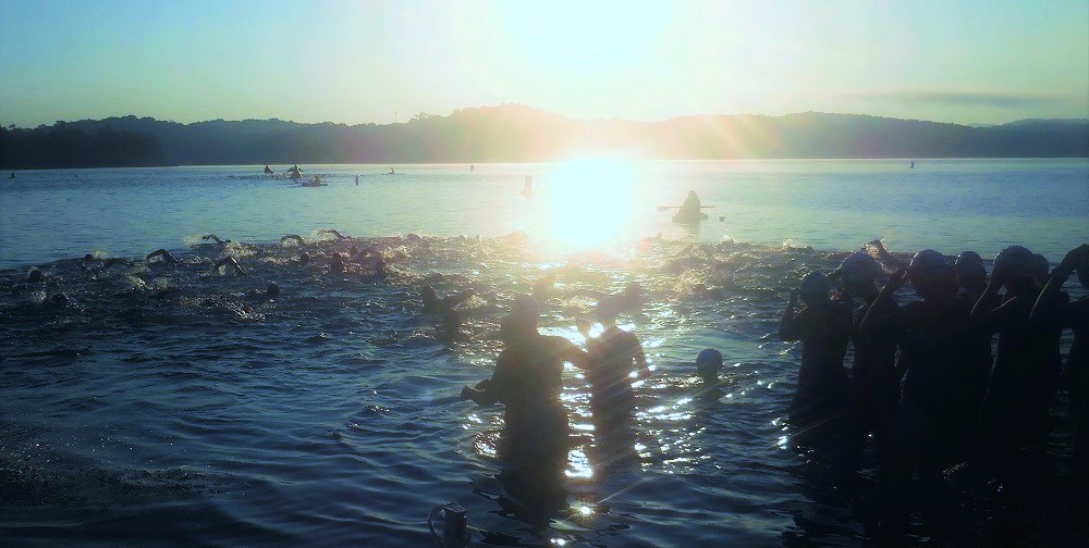 Athletes wait for their 600 yard swim starting at the boat ramp at Lake Blue Ridge Marina. They swim a course marked by buoys in the lake and exit the water at boat ramp.