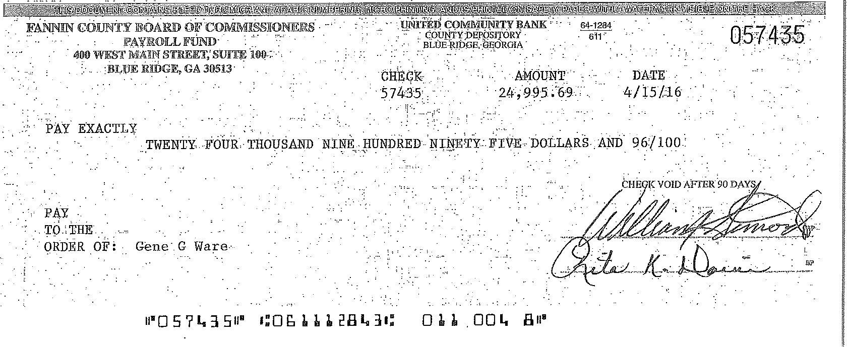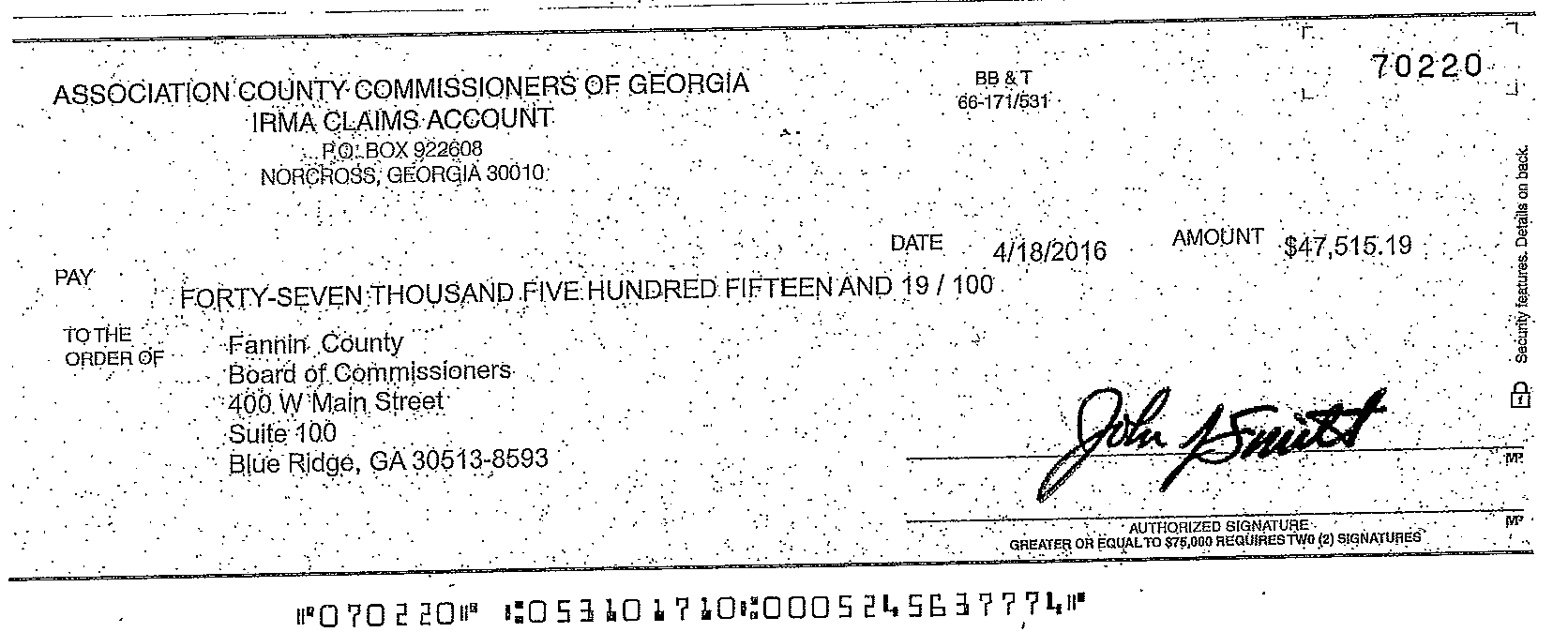 News May 6, 2016At the May 2 meeting of the Fannin Board of Commissioners, checks totaling $208,000 were at the center of a controversy within the Board of Commissioners (see “Bill Simonds Admits to Signing Checks Totaling $208,000 without Commissioners’ Approval). The checks were signed and sent to Association of County Commissioners of Georgia (ACCG) on April 15, 2016. ACCG is a para-governmental organization which handles liability insurance for the Board of Commissioners. On April 18, 2016, the insurance company reimbursed the Board of Commissioners the full amount of the checks.